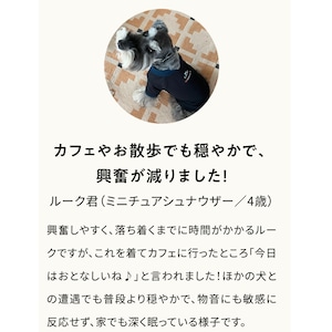 お散歩後や運動後のクールダウンなど「オン」から「オフ」への切り替えに、来客やお留守番など緊張・興奮しやすいシーンに、おうちでのリラックスタイムや就寝時の休養サポートにおすすめです。